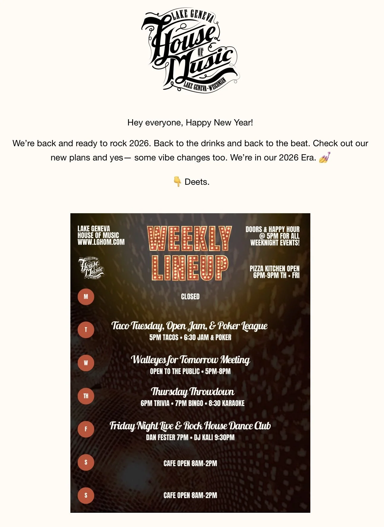 I led newsletter production for a multi-use venue hosting live music, markets, private events, recurring community programming, and food and beverage offerings. The newsletter functioned as both a weekly editorial publication and a primary communication tool for audiences, vendors, and collaborators.
